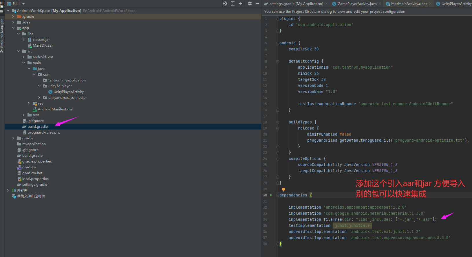 新建AS工程然后导入unity下路的classes.jar包, 2019版本及以上版本中classes.jar包中可能没有UnityPlayerActivity,需要单独重新导入